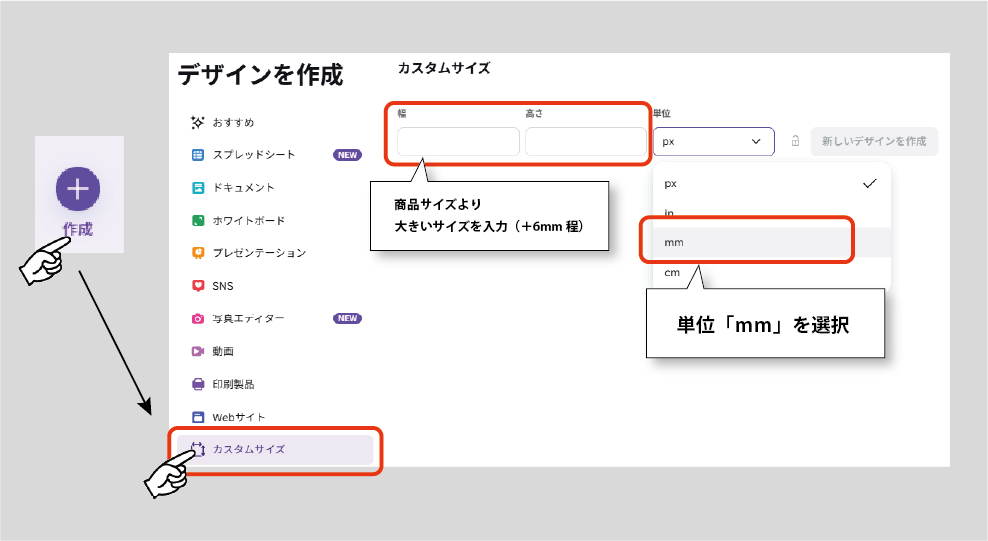 ①Canvaのサイトを開き、〔作成〕→〔カスタムサイズ〕をクリックしてください。