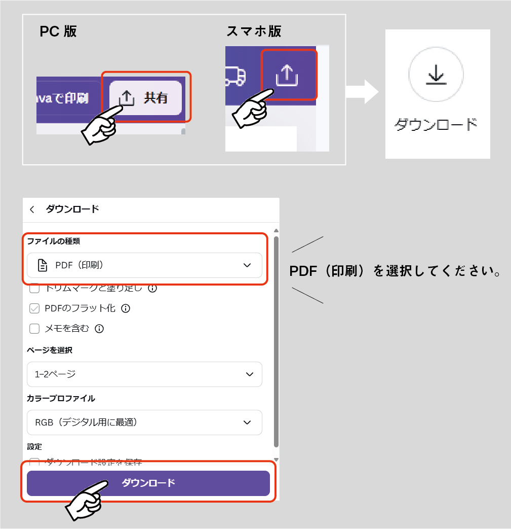 ファイルの種類は「PDF(印刷)」を選んでください。