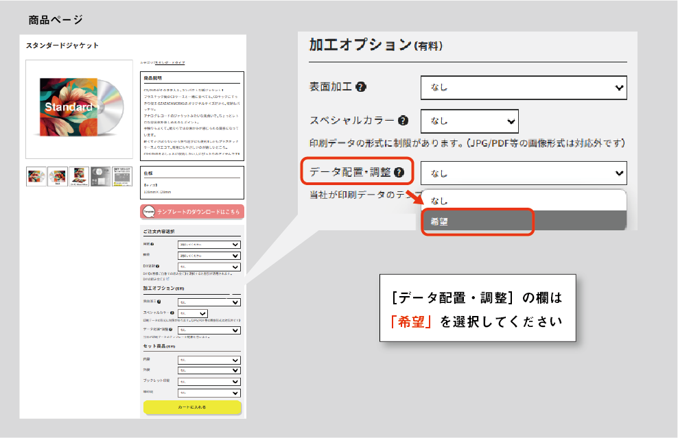 例えば、スタンダードジャケットの場合、実寸サイズ「128㎜×128㎜」なので「134㎜×134㎜」以上が望ましい。
