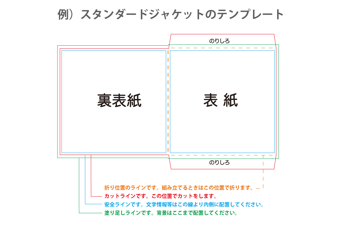 テンプレートには、それぞれ「安全ライン」「塗り足しライン」など、デザインを配置するうえでのガイドラインを設けています。