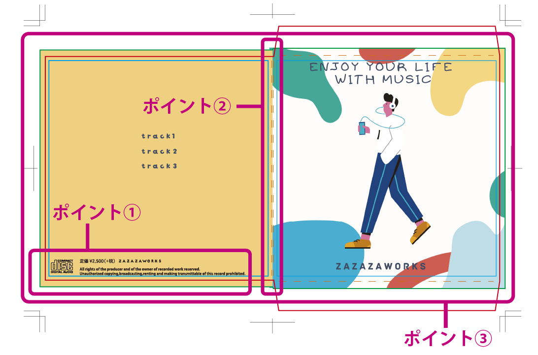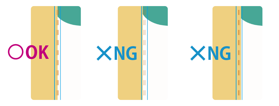 表紙と裏表紙の間など、面の境目は、折りライン上(もしくはラインとラインの間)でデザインが切り替わるように配置してください。