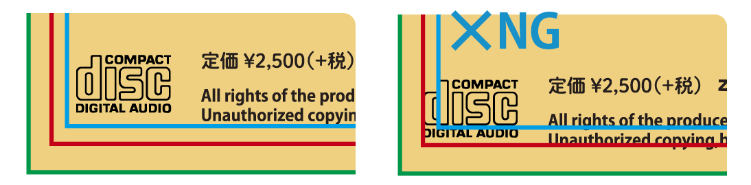 文字など、切れると支障のあるデザインは安全ラインの内側に配置してください。安全ラインの外側に配置したデザインはカットラインや折り位置と近くなる為、カット時の若干のズレにより、仕上がった時に切れてしまう可能性が高くなります。