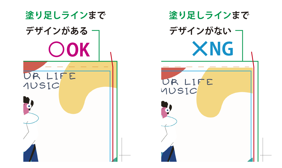 背景のデザインは塗り足しラインまで配置してください。実際には切れてしまう部分とはなりますが、塗り足しラインまで背景が足りていないと、カット時の若干のズレにより、仕上がったときに紙の色(白)が出てしまいます。
