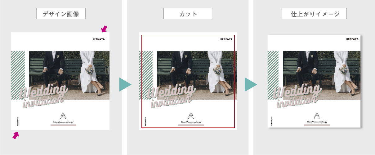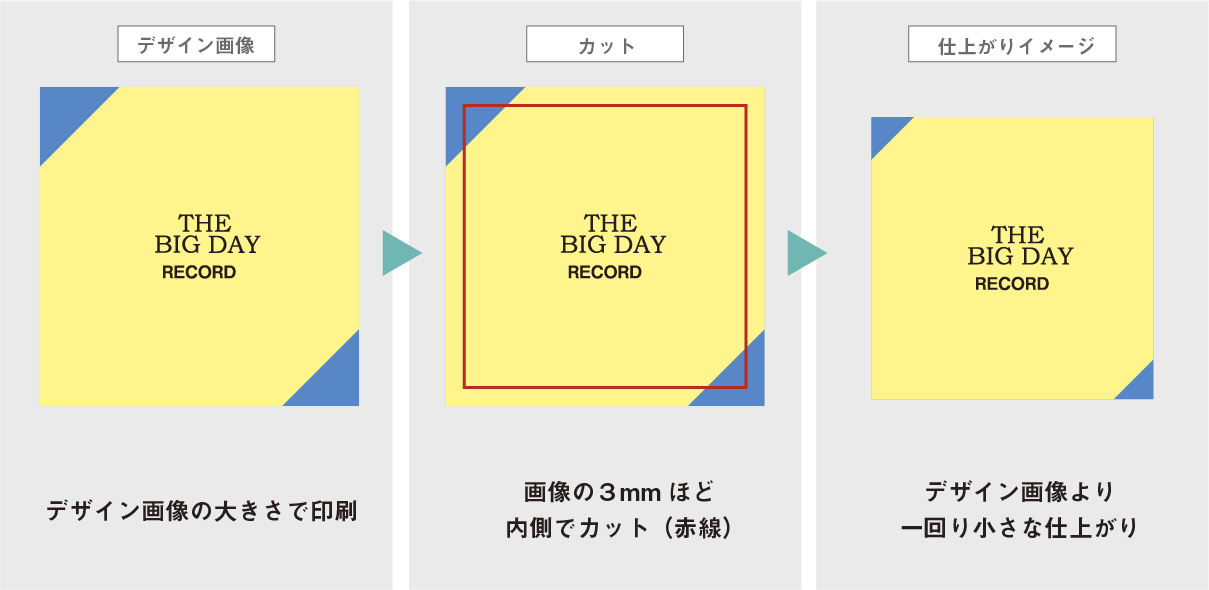 その為、仕上りピッタリのサイズで印刷し、カットをするのではなく、大きめに印刷をして、端を切り落とすようなカットを行います。基本的に端が切れることを想定して、仕上りの想定より一回り大きくデザイン画像を作成してください。