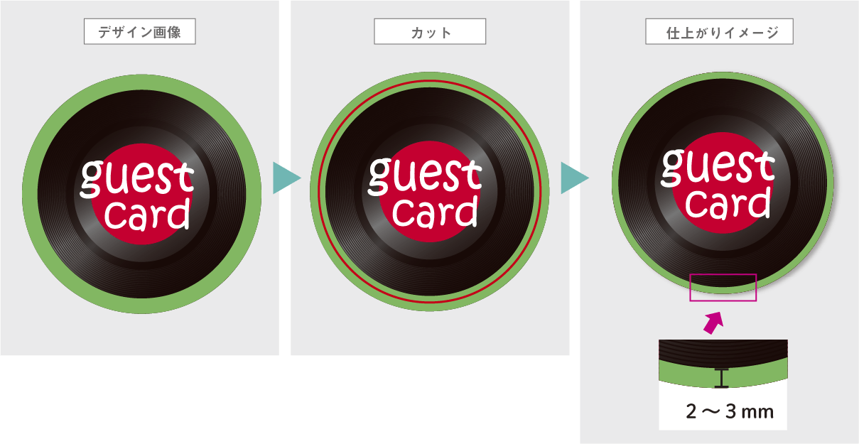 フチの幅が狭いとカットのズレが目立ちます。仕上がったときに最低2~3mmはフチ幅がつくようにご検討ください。