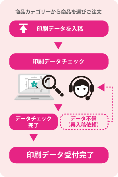 完成した印刷データは、ご注文手続きの中で入稿してください。入稿後は、当社スタッフがデータのチェックを行います。データに不備があった場合は、メールにて再入稿の依頼をします。不備の無いデータが入稿された時点で、印刷データの受付となります。